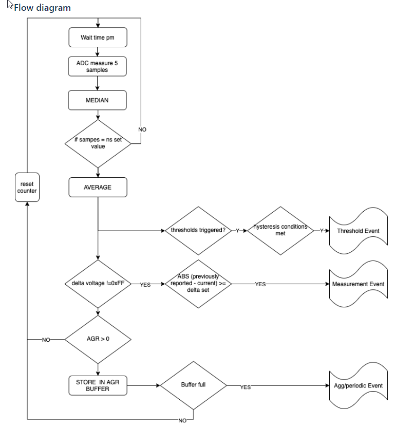 **Measurement period** is how often voltage is measured. **Number of samples** tells the device how many measurements need to be taken before an event is sent/record is stored.